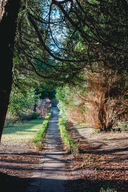 A peaceful winter path, where trees stand still and the light gently filters through the quiet park.