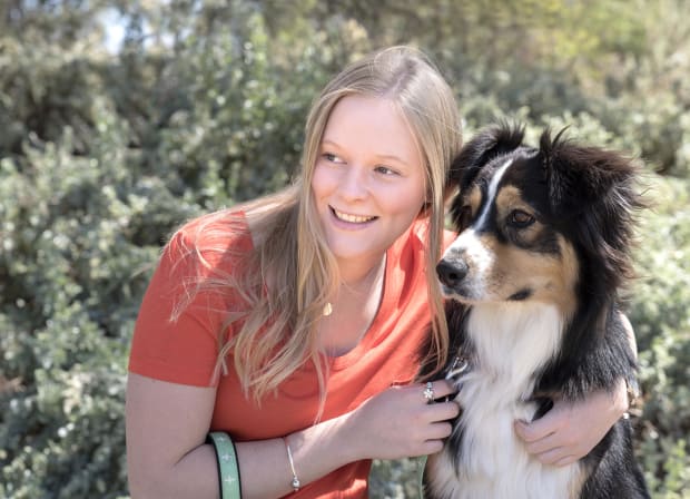 A young woman and her dog share a special moment as they look at something that interests them both.