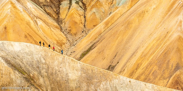 Walkers on an exposed ridge of Brennisteinsalda (Sulphur wave), in Iceland's highlands.