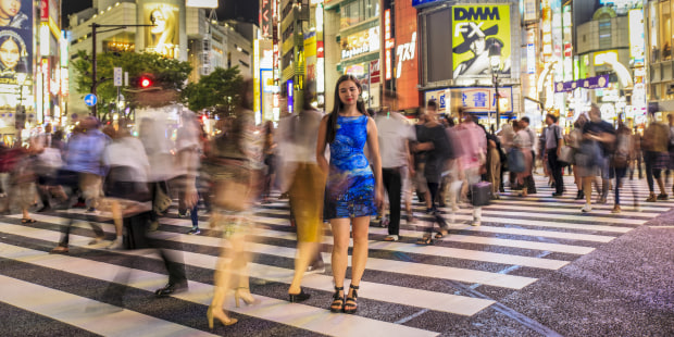 Caitlin posing as the world continues around her on one of the busiest intersections in the world, Shibuya Crossing, Tokyo