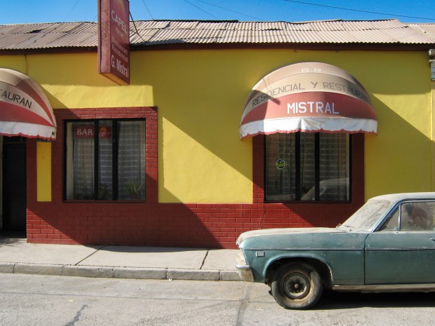 While visiting Chile, I stumbled upon this nice contrast between the restaurant with shiny and vibrant colors, and this old dusty car.