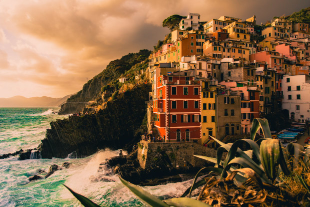 For a brief moment the setting sun shone through the storm clouds, lighting up the colourful homes of Riomaggiore, Italy.