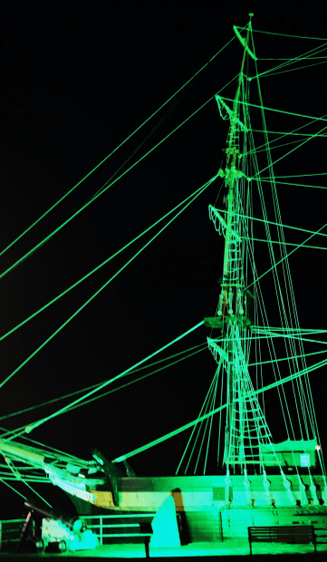 210 yo replica Brig Amity in Albany WA entirely starboard light at night.