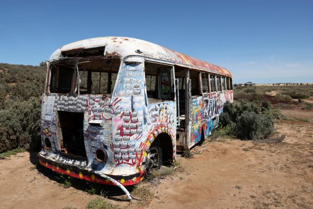The bus at Lake Tyrell a salt lake near Sea Lake Victoria Australia.