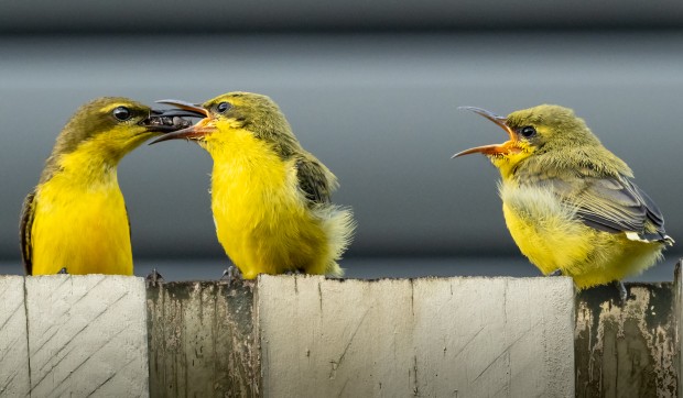 The Sahul sunbird chicks have fledged but are still being fed by mum.