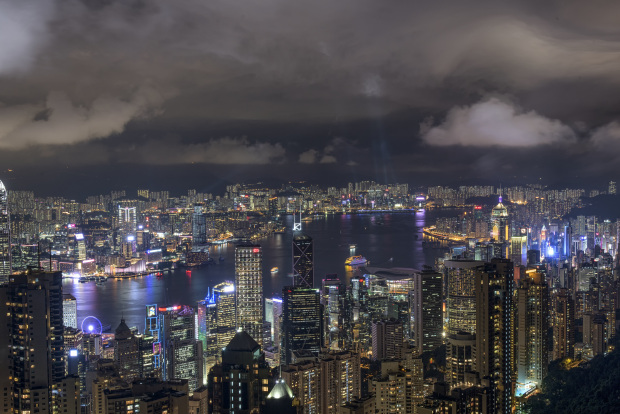 A glimpse of Laser Show, Symphony of Lights, from Victoria Peak, Hong Kong on a rainy day