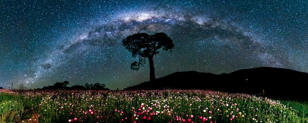 A field of pink and white Everlasting Daisies sleeping under the Milky Way Arch