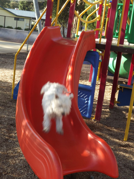 We stopped at a park on a trip early one morning to give our gorgeous Westie Boner a break, when he thought he would give the kids slide a go !
