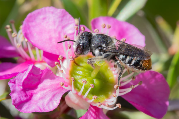 A Megachile resin bee feeding on the nectar from a pink tea tree flower.