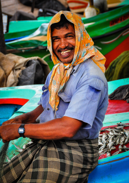 Smiling fisherman with orange head scarf