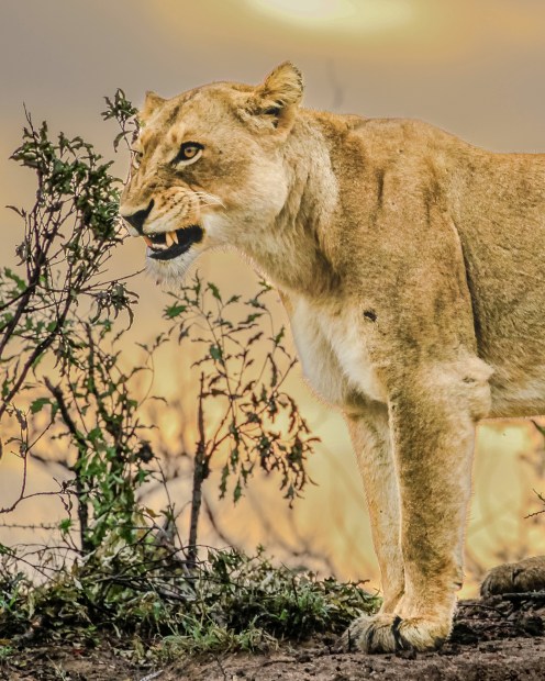 A lioness snarls at sunrise in Kruger National Park