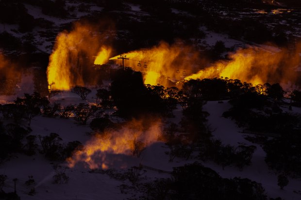 I was lucky enough to be up at Mount Perisher one morning looking over the valley at sunrise. I waited for the sun to rise and the light created these fire-like patterns on the snow guns as they readied the resort for opening.