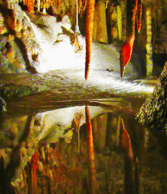 Caves revealing mirrored formations in shallow pool of water