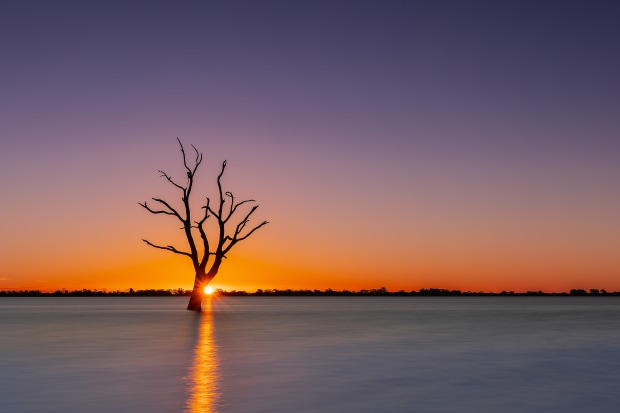 The last rays of sunset pierce through a lone tree, casting a golden reflection across the tranquil water.