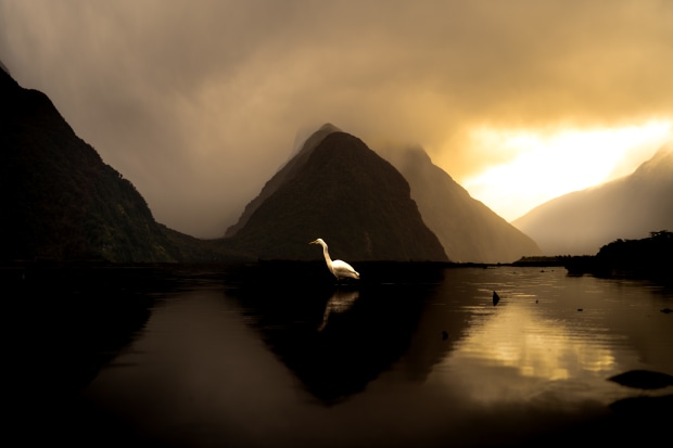 Bathed in the golden glow of a brooding Fiordland sky, this image captures a fleeting encounter with a great eastern egret—an exceptionally rare visitor to Milford Sound. The lone bird stands motionless in the still waters, perfectly mirrored beneath the shadowed peaks. Its ghostly white form, set against the dramatic silhouette of Mitre Peak, reflects not only a moment of peace in a wild and storm-shaped landscape, but a testament to the unpredictability and quiet magic of New Zealand’s most iconic fjord.
