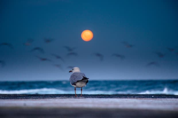 I had no planning in composing this shot. I knew I wanted a shot of the rising moon - within a few seconds a lone seagull landed in front of me and a flock of seagulls were flying by. Instinctively I dropped to the ground and took two shots before the seagulls in the background flew by and the lone seagull flew away.
