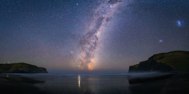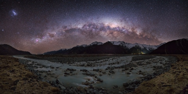 A selection of panoramic-style nightscape images capturing various views of the Milky Way galaxy in the dark winter skies for which New Zealand is well-known. Two images are from coastal locations in Canterbury and the others feature landscapes in the Aoraki Mount Cook National Park.