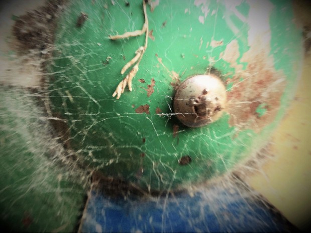 Self-explanatory I guess, spiders finding a painted tin outside flower attractive enough to spin their webs.