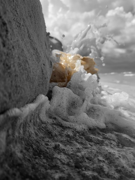 In a fleeting moment, waves energetically embrace weathered stones, highlighting nature's rhythmic beauty and resilience. This close-up captures both the intensity and intimacy of water’s continuous conversation with the shore.