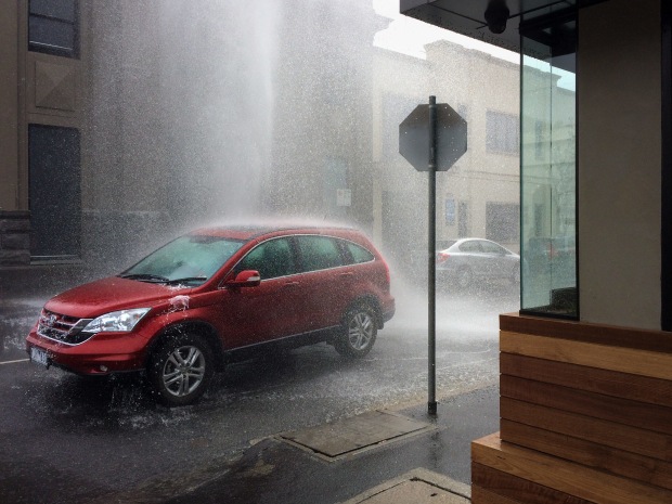A red car gets an unscheduled carwash courtesy of a burst water main