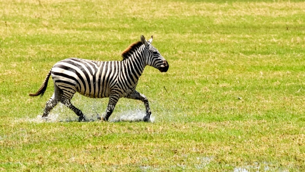 A zebra splashes through a waterway in Amboseli National Park in Tanzania