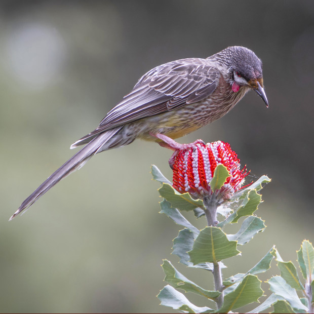 This Red Wattlebird has a breakfast choice of nectar or the spider hiding in the web at the base of the Scarlet Banksia.