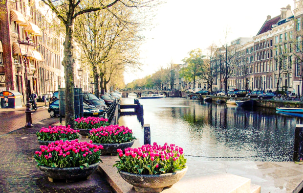 The nine canals area of Amsterdam is very charming and popular with tourists and locals. The flower colours pop out amonsgt the newly leafed trees.