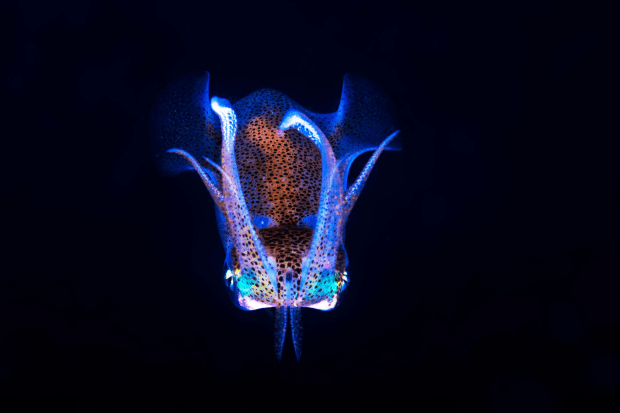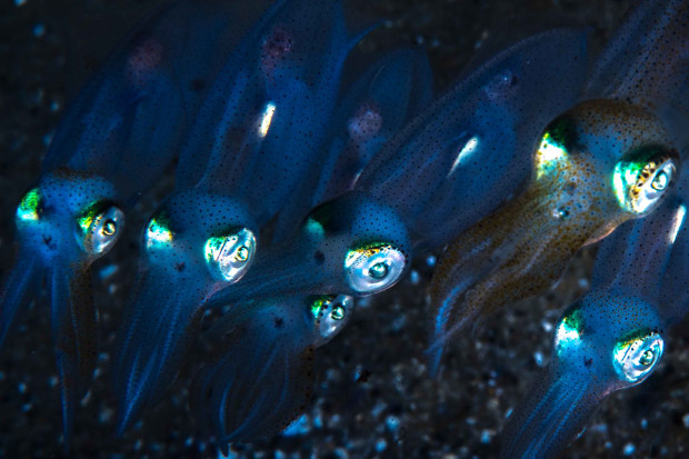Squid are beautiful and fascinating and a great photo subject for underwater night photography. They have no bones and swim by jet propulsion, shooting seawater from a funnel. They can propel so quick that sometimes it seems they disappear into the water leaving behind sometimes an ink trail . They are both scared and attracted to the camera focus lights ending in their ever changing display of exciting colours and various tentacle positions .