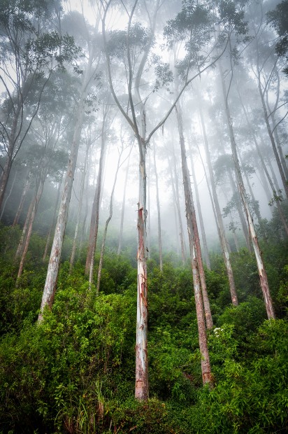 Tall trees in the morning mist