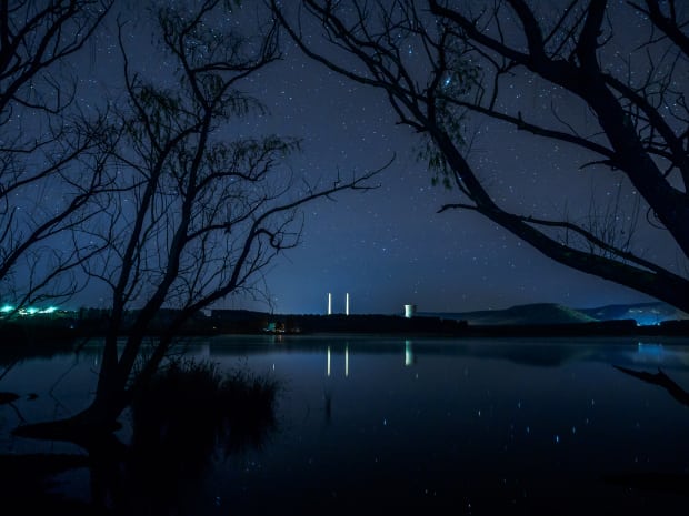 The now non operational power station at Wallerawang in NSW. The lake was man made for the power station and the silos glow at night under clear country skies