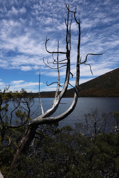 A dead tree reaches up, framed by the colours of Dove Lake, Cradle Mountain.