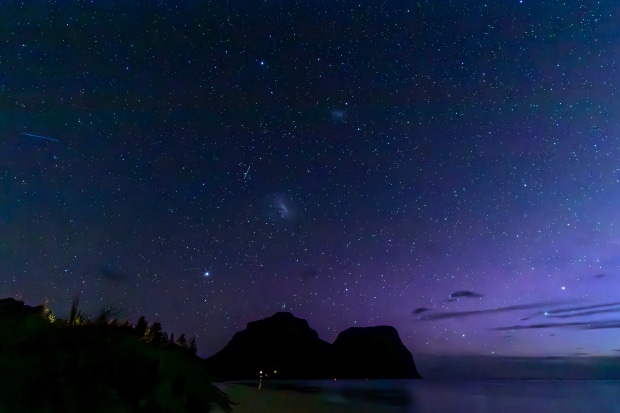 Looking across the lagoon to Mts Lidgbird and Gower on Lord Howe Island. Stars, satellites and the pinky tinge of aurora australis (southern lights) put on a show.
