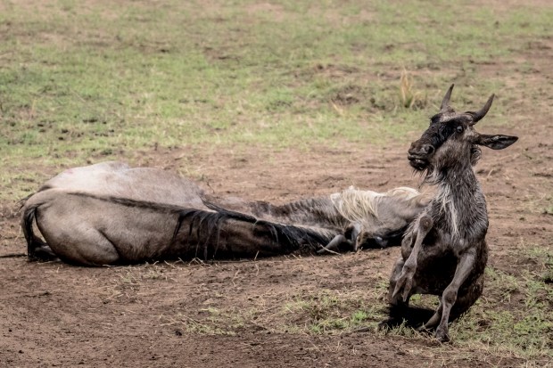 This young Wildebeest was lying 'dead' next to the big Wildebeest. Both had been 'killed' by a lion. Then the young one started to wriggle and wobbled until it stood up and re-joined the herd. This was taken as it started to stand up and shows the strain on it's face of it regaining life.