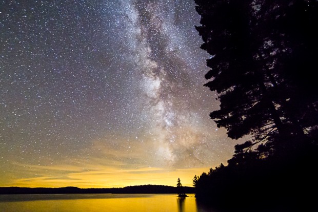 Stellar trees light up the night sky. This is the night-time view of the Milky Way from the edge of our campsite on our canoe trip to Big Trout Lake in Algonquin Park, Ontario, Canada.