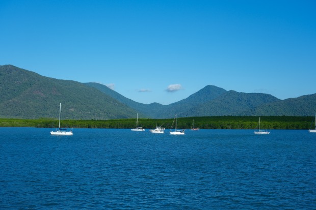 Sailboats drift calmly near the mangroves of Cairns, framed by the lush rainforest mountains of Far North Queensland. A quiet moment of balance between sea, sky, and land in the tropics.