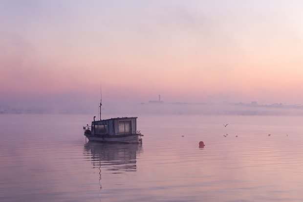 Canon 5D 1V 70mm, f5.6 1/30sec Iso 100 A still morning with an old boat so calm and peaceful. Fog masking the busy, heavy industry that hums away in the background.