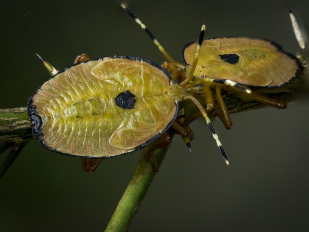 A pair of stink bugs engaging themselves on the tea tree twig