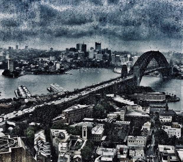 Looking north over the Harbour Bridge on a very stormy day in Sydney