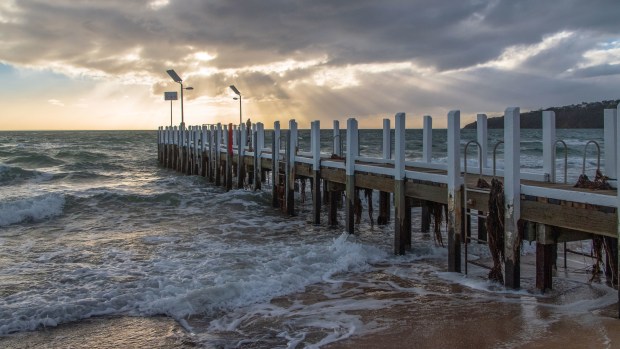 A cold, windy afternoon, with the sun rays just breaking through at Safety Beach Jetty