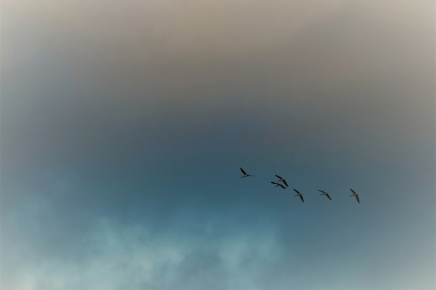 Gayle Marien, Straw-necked ibis flying beneath the clouds at dusk. (January Theme: Blue)
