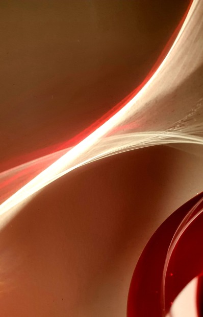 Sunbeams streaming through the shutters bounce off the wall in beautiful curves, and gain a red colour from the nearby vase.