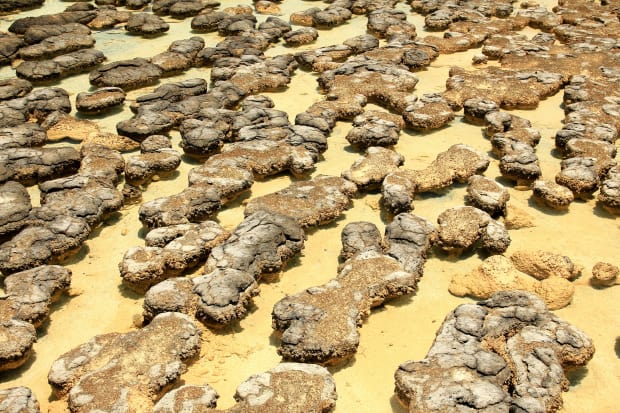 Shark Bay in Western Australia has numerous stromatolites growing at the edge of the ocean. A detail of their growth makes an amazing pattern of one of the first leaving creatures on Earth.