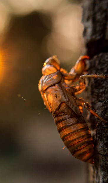 Sun setting through the smoke from the summer fires, lighting up a shed from this season’s cicadas