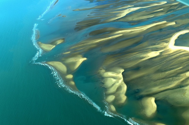 A photo taken from a tiny plane allows the sandbars that rise from the bed of water surrounding Palm Island look like an abstract painting.