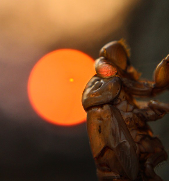 Sun setting through the smoke from the summer fires, lighting up a shed from this season’s cicadas