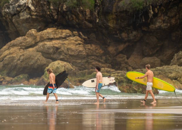 Three surf mates enter the ocean on a summer day at North Stradbroke Island (Minjerribah). What else can summer be?