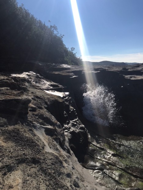 Photo of water splashing against rocks with sun shining on water at Dudley Beach