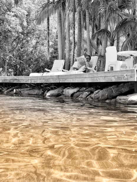 An image capturing the flow of water under a bridge. Above is the usual Sunday weekend activity.