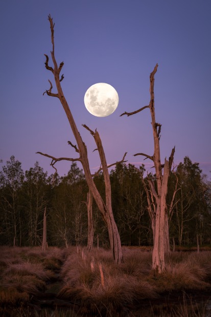Full moon rising at sunset over Hexham Wetlands