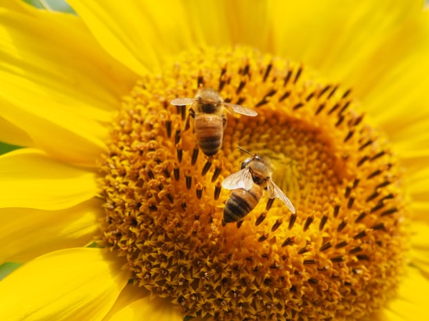 Macro shot of two bees pollinating a sunflower
